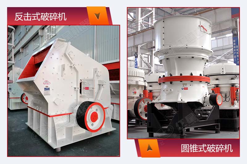 反击破/圆锥破,这两种配合在颚式破碎机作业的碎石机,将石料可再次粉碎成符合制砂粒度要求的建筑石子;反击破则是针对中等硬度以下石头细碎效果更好;圆锥破则更适合硬度比较高石头细碎加工;这两者根据所加工的石头选择;