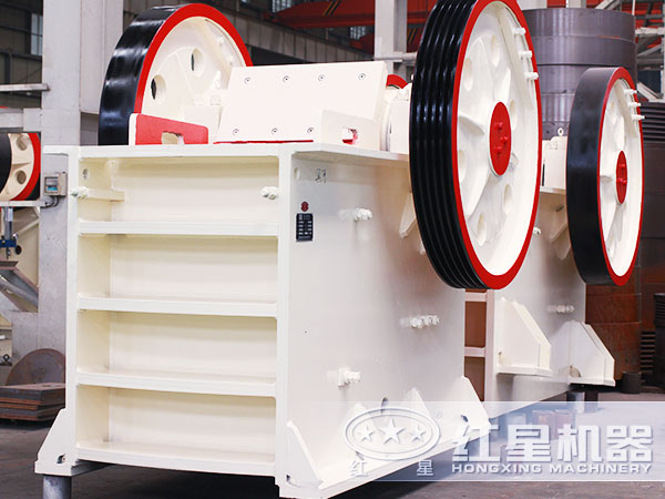 该设备组成结构简单,运行可靠,主要由机架、飞轮、偏心轴、颚板、大皮带轮、肘板等几部分组成。
